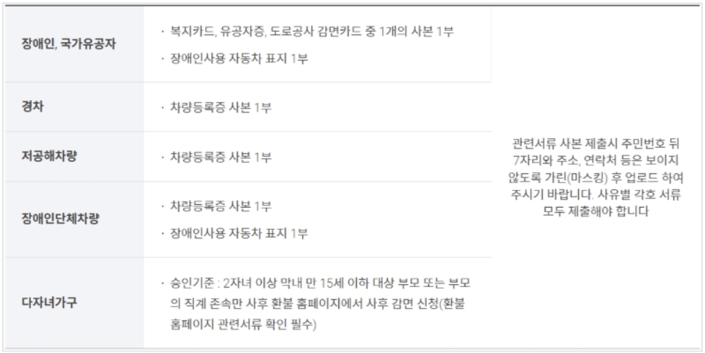 주차장 출차 시 자동감면혜택을 받지 못한 경우라면 아래표에 해당하는 서류를 준비해서 출차 후 30일 이내로 사후환불 신청 홈페이지에 출차 영수증 번호와 제출하시면 할인혜택을 받을 수 있어요.
