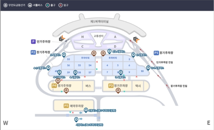장기주차장은 터미널과 다소 거리가 있어, 위 지도에 주황색으로 표시된 탑승장에서 무료 셔틀버스를 타고 터미널로 이동하실수 있습니다.