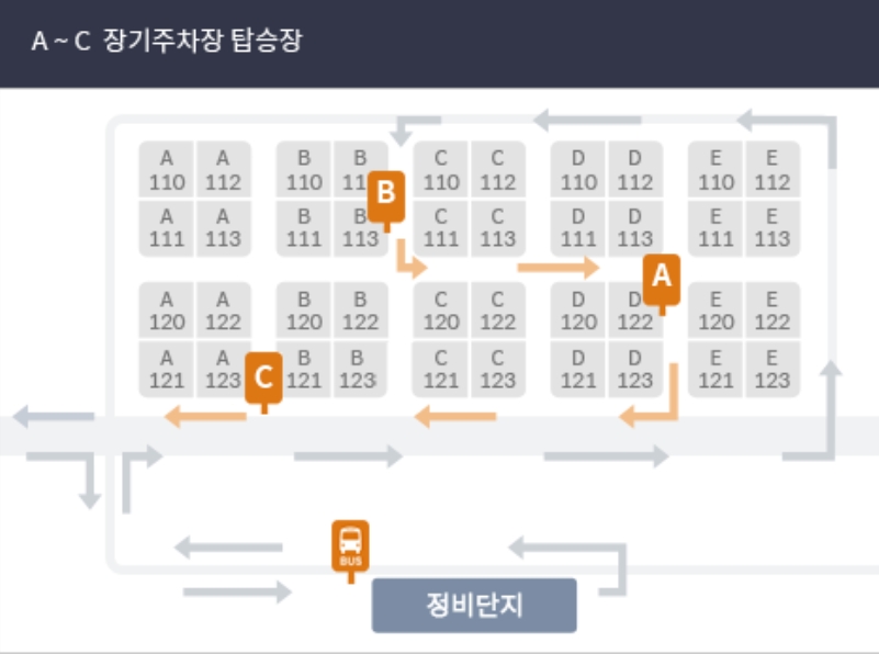 장기주차장과 여객터미널 간의 거리가 다소 있는 관계로, 위 지도에 주황색으로 표시된 A, B, C 버스 탑승장에서 무료 셔틀버스를 타고 터미널로 이동하실수 있습니다.